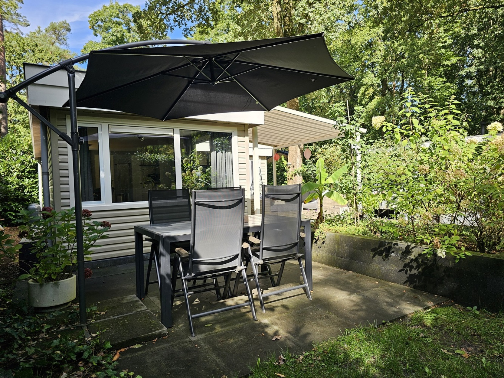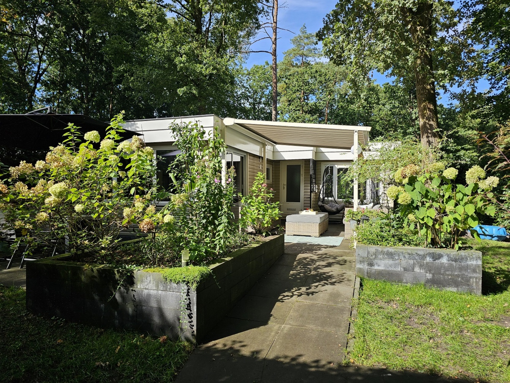 L-chalet 2Slk op privé gelegen kavel nabij de bosrand!Kom eens een kijkje nemen bij dit leuke L-chalet! Gelegen op een heerlijk rustige kavel nabij de bosrand met een ruim aangelegd terras met sierplanten en een uitschuifbaar zonnescherm. De tuin is omringd door een beukenhaag waardoor je erg privé zit. Zoek een plekje uit op een van de terrassen, of misschien wel op het grasveldje onder die prachtige eik om te genieten! De chalet is voorzien van twee slaapkamers, badkamer met douche, apart toilet en een gezellige woonkamer met pellet kachel. Zie jij jezelf al genieten op deze plek? Plan dan snel een bezichtiging!