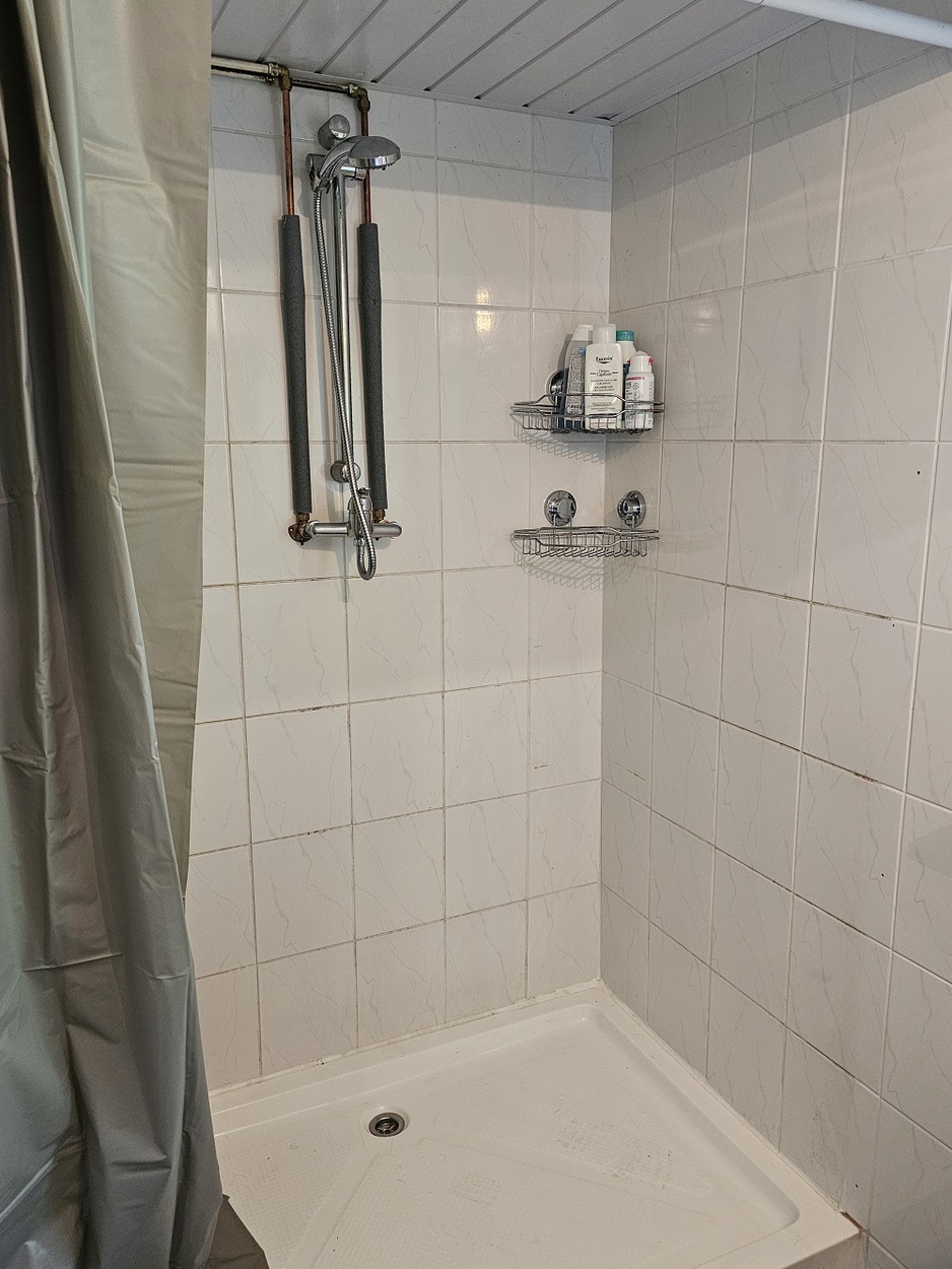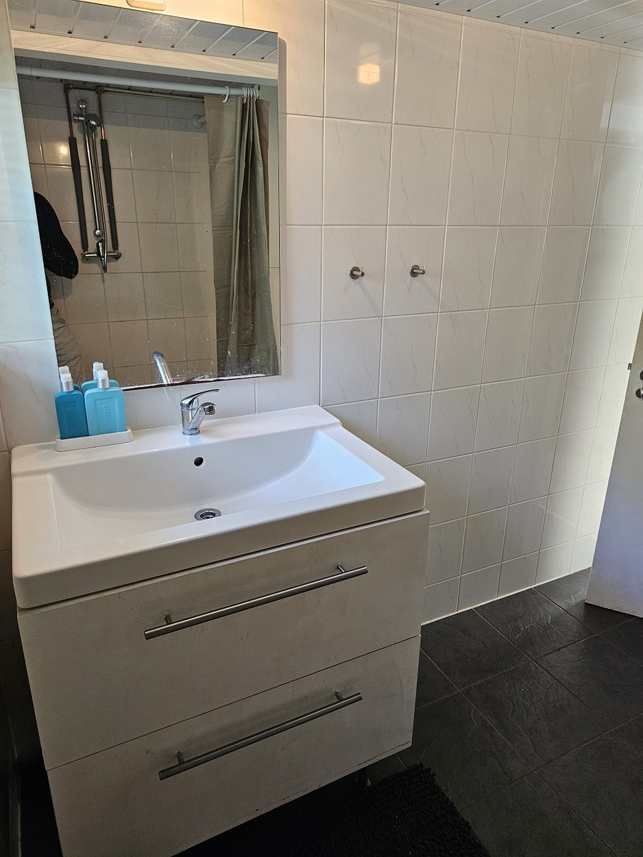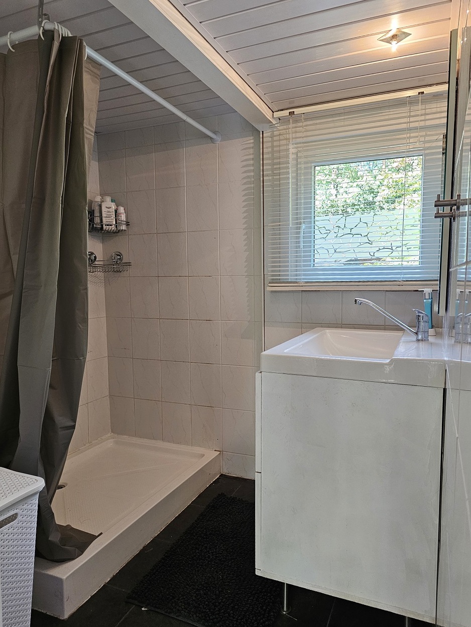 - Betegelde badkamer met douche en wastafel