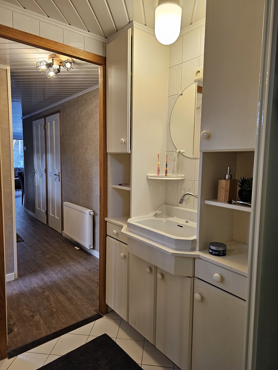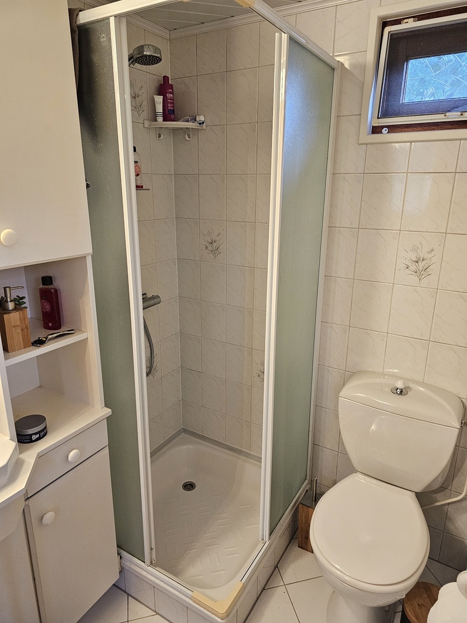 - Betegelde badkamer met toilet, douche en mooi badmeubel
