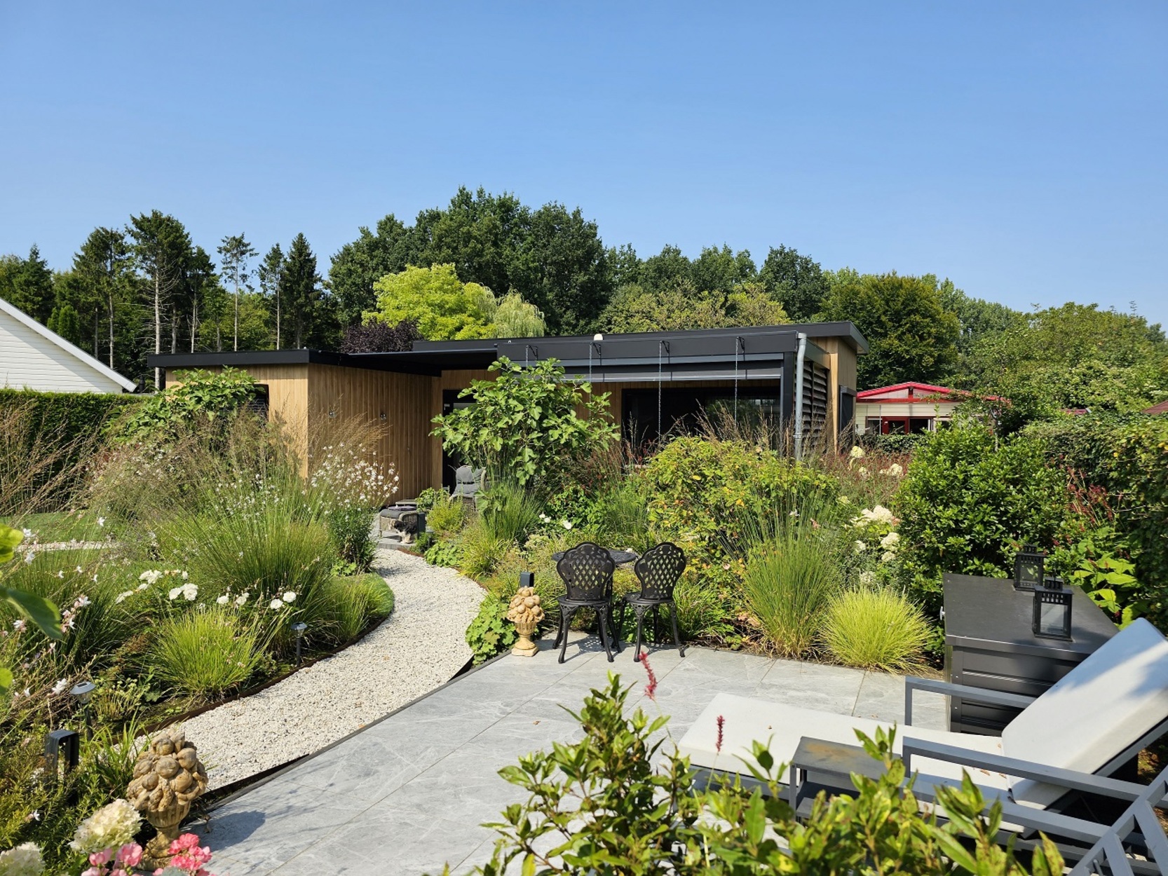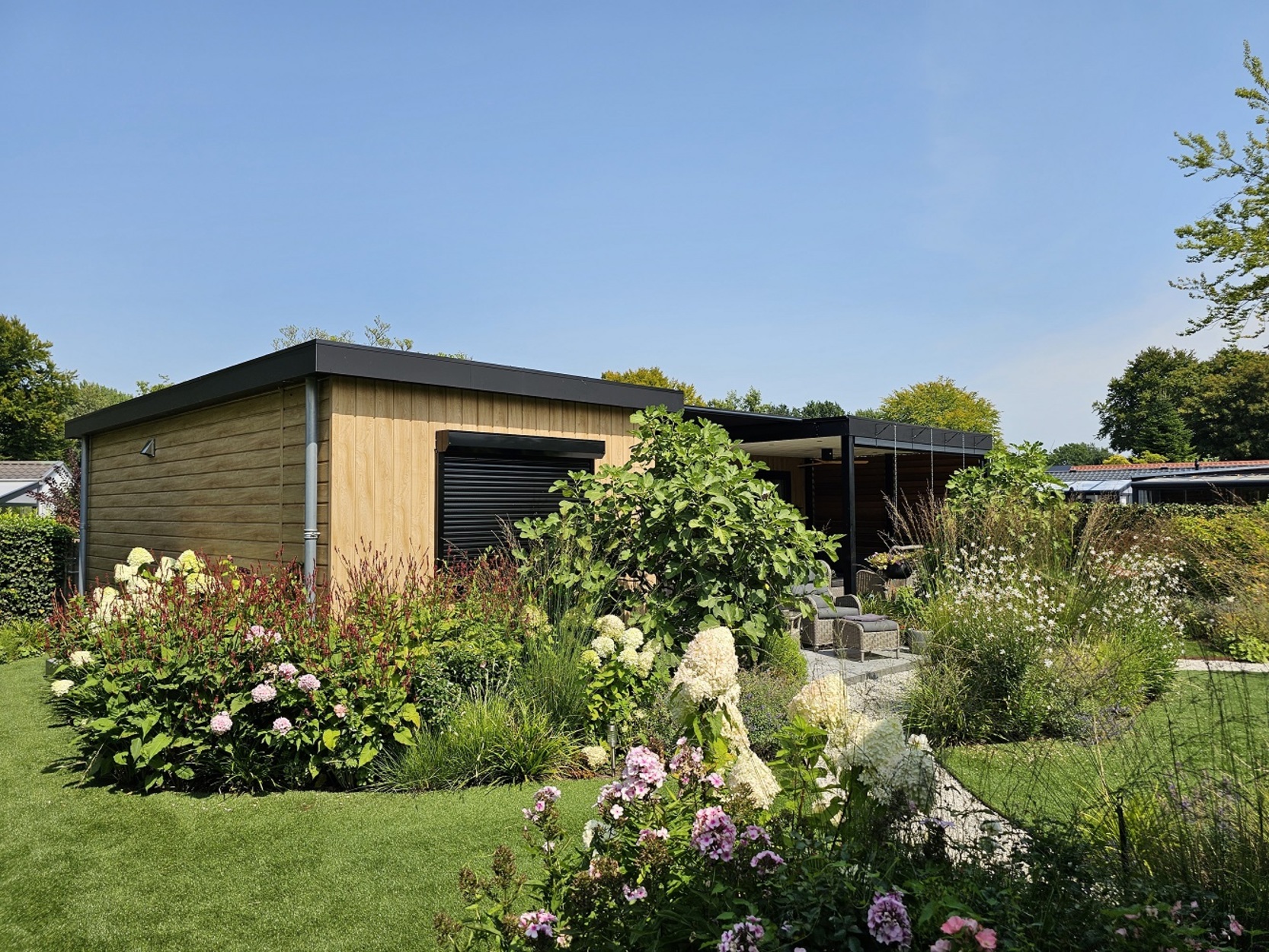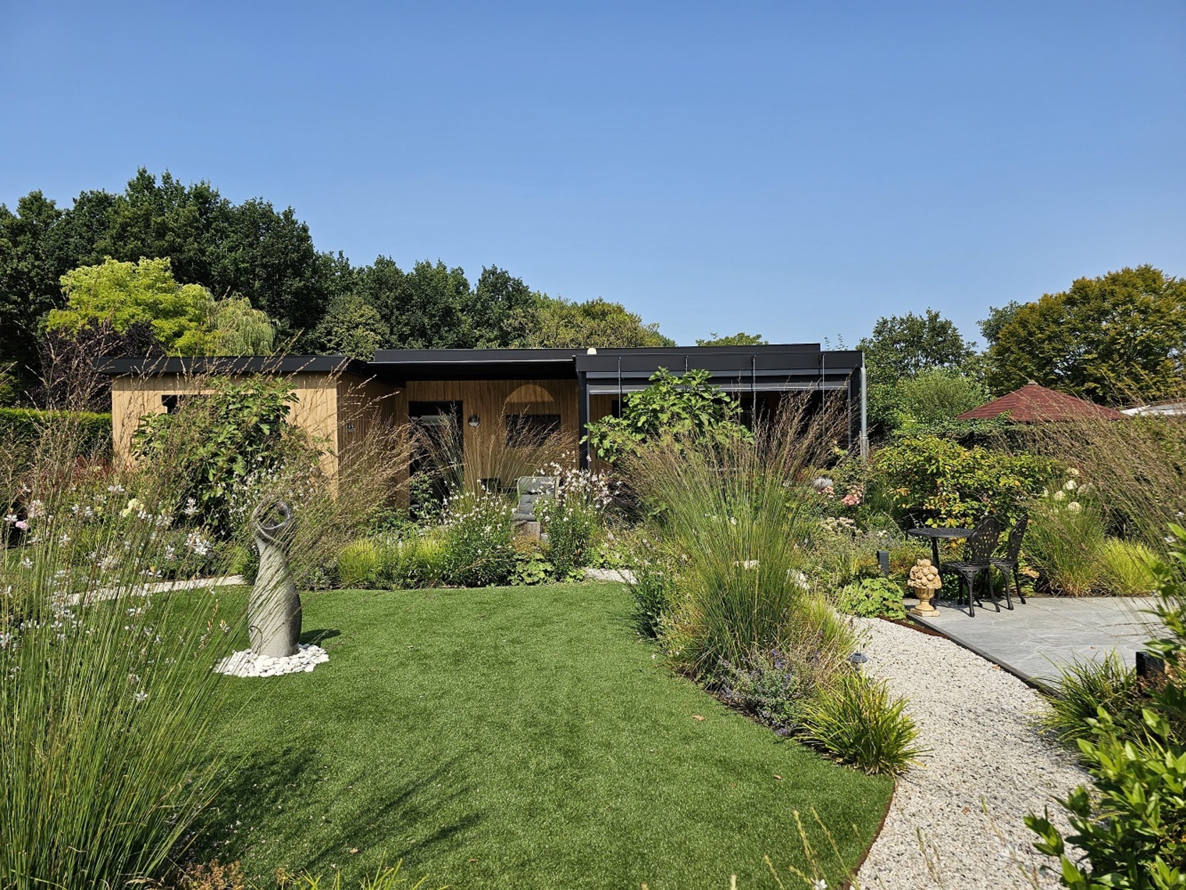 - Tuin voorzien van prachtige beplanting, kunstgras, INLITE tuinverlichting en bewatering
