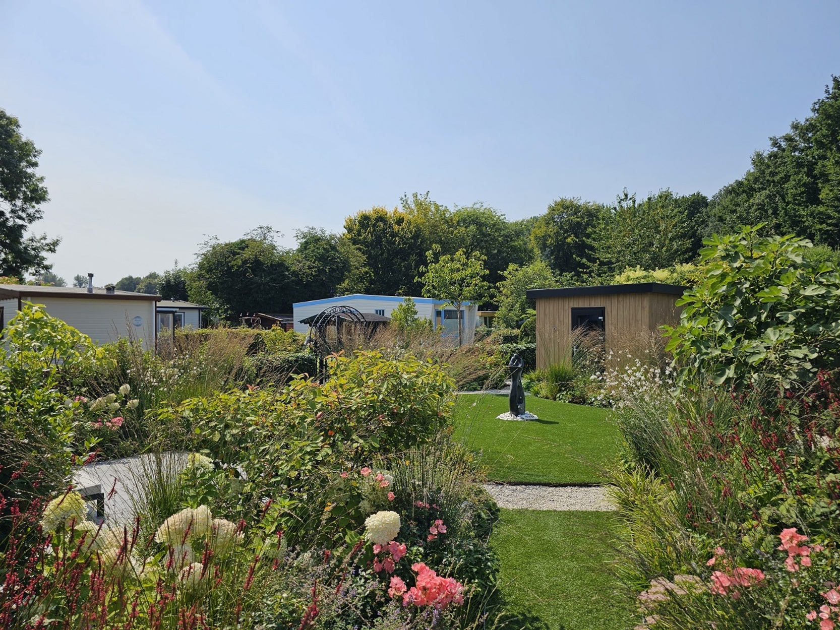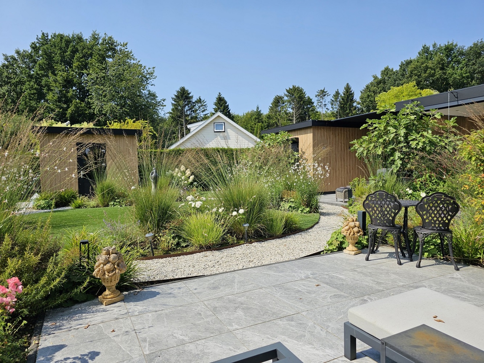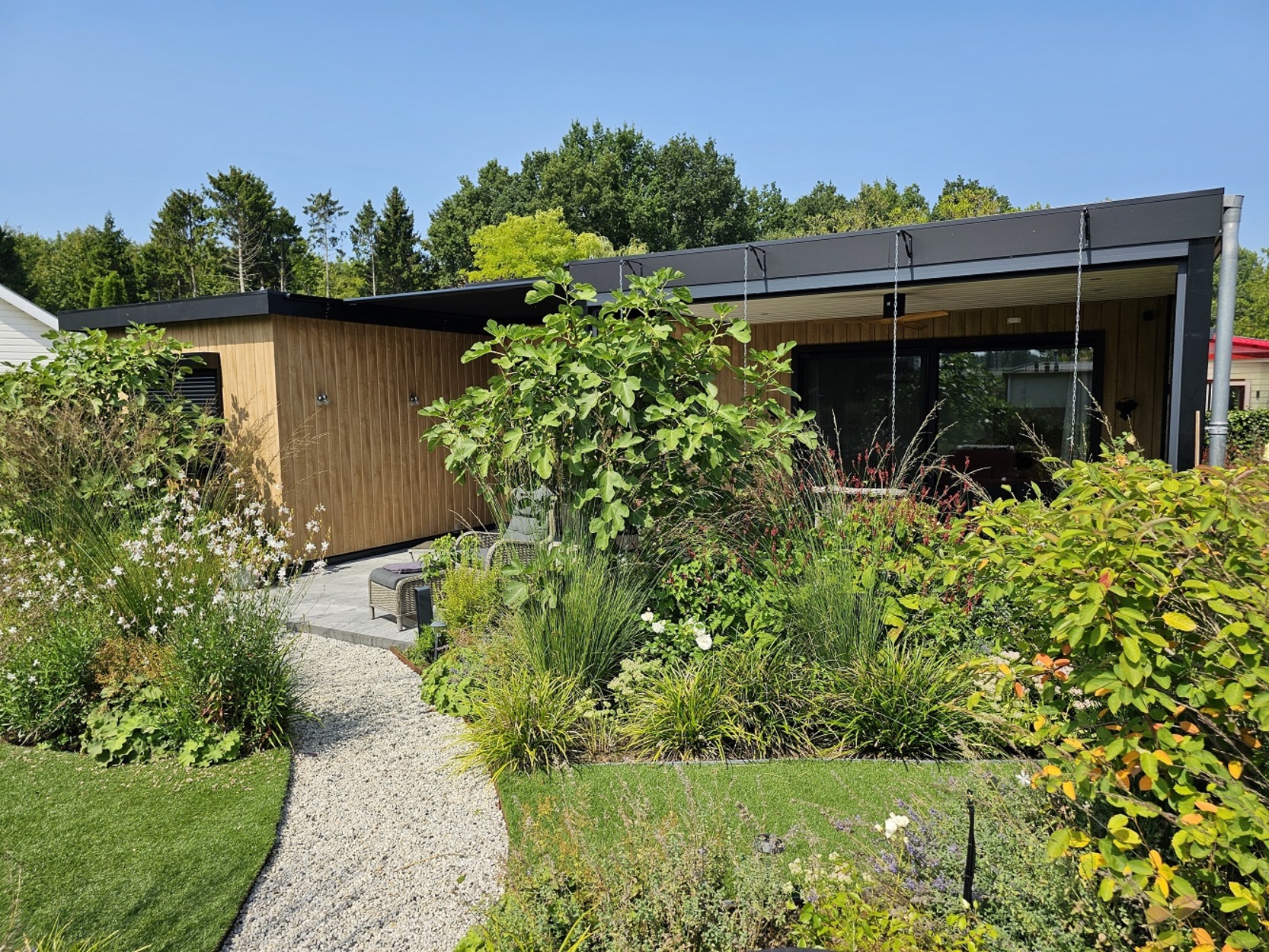 - Tuin voorzien van prachtige beplanting, kunstgras, INLITE tuinverlichting en bewatering