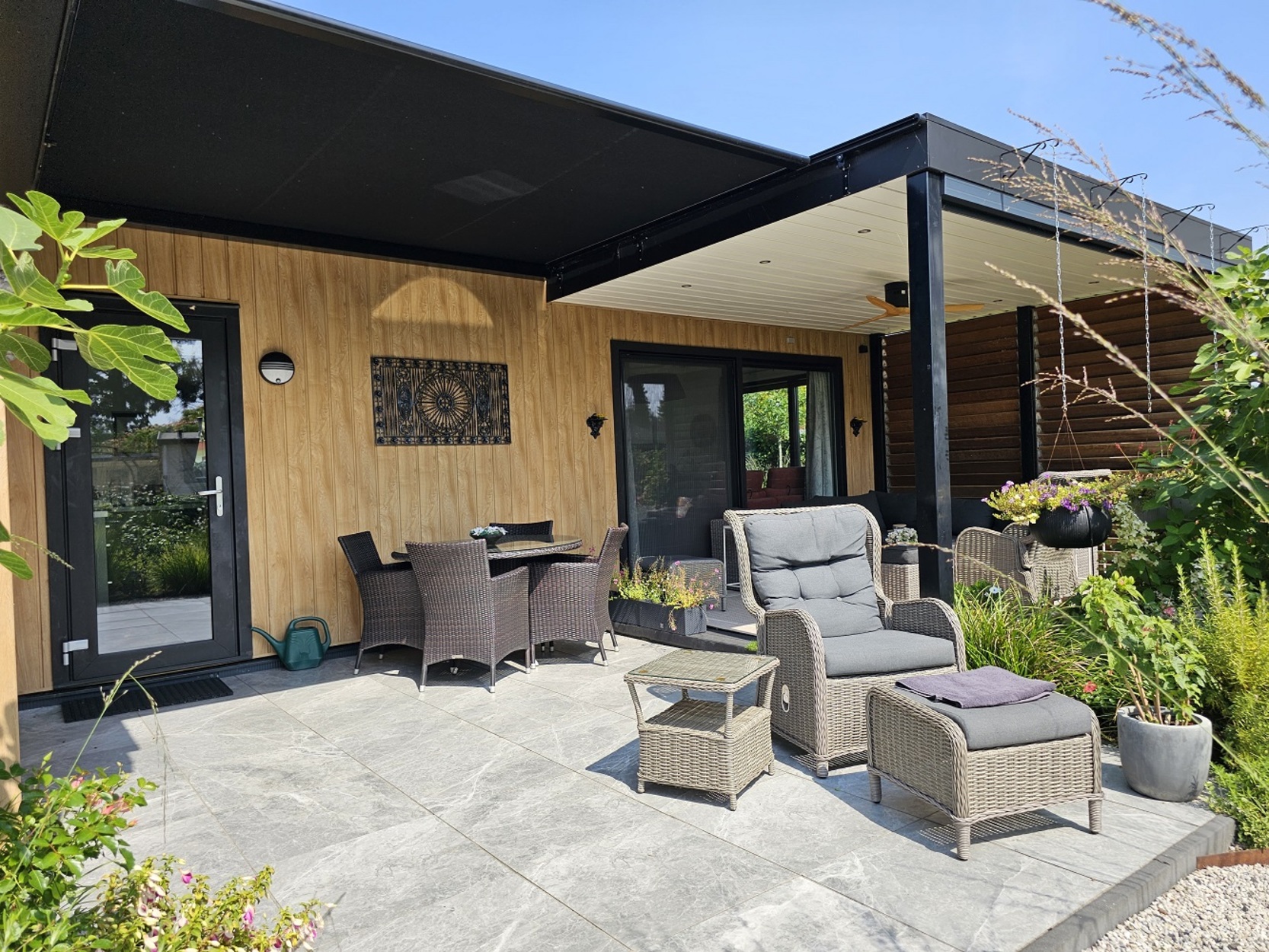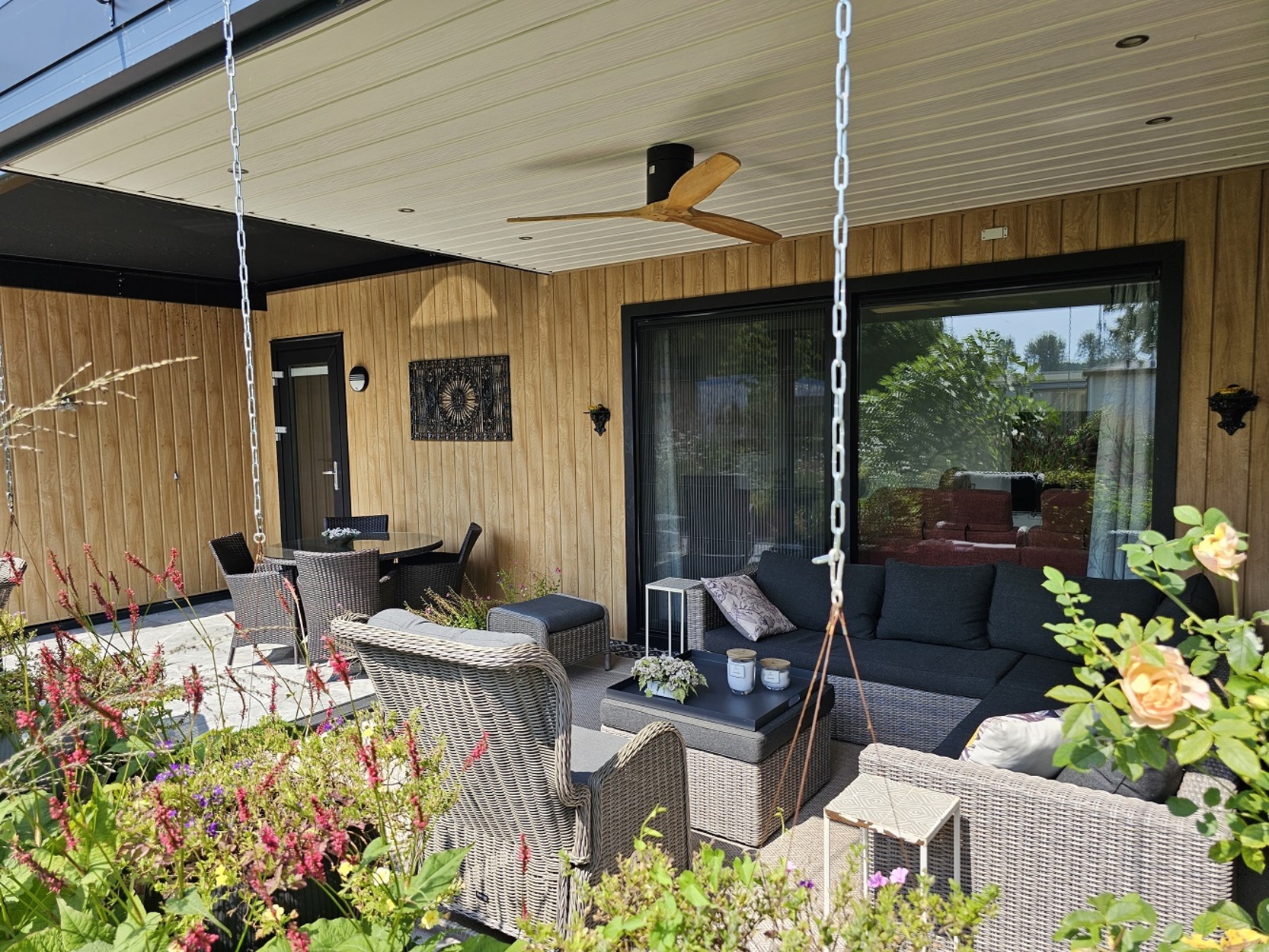 - Een schitterende luifel met houten shutters en zonne screen