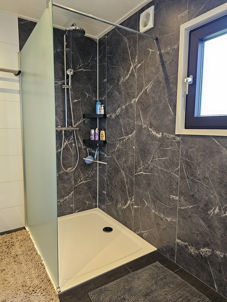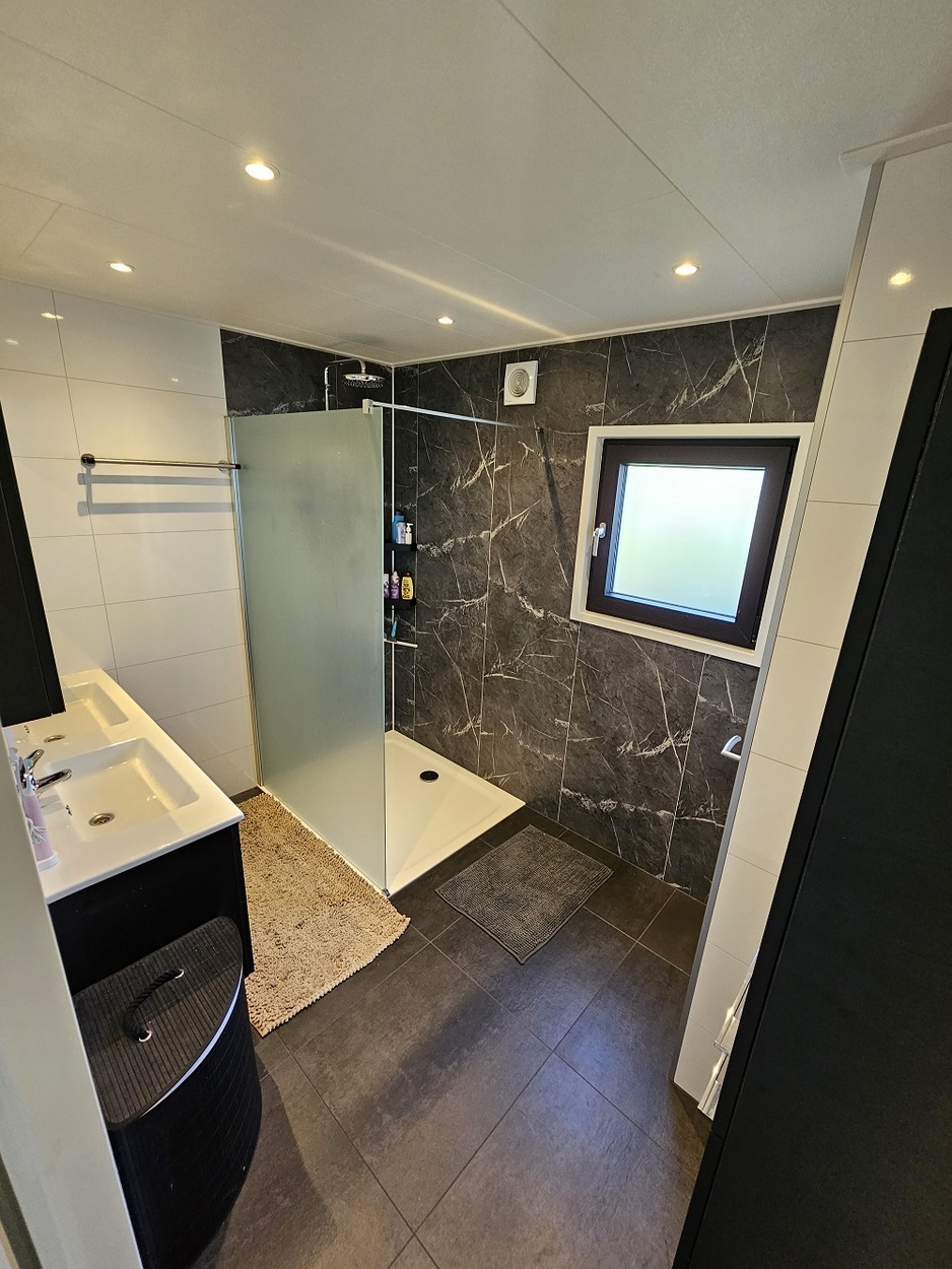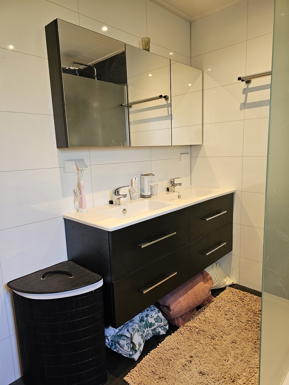 - Badkamer met grote inloopdouche 120x100, breed bad meubel, hoge kast