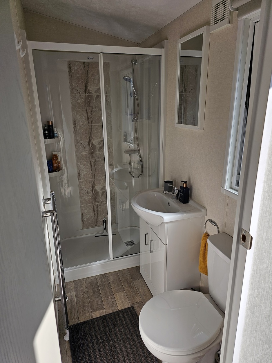 - Badkamer voorzien van douchecabine, afzuiger ventilator, wastafelmeubel en toilet